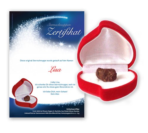 Sternschnuppen bringen Glück, wenn man sie sieht. Außerdem ist es romantisch, wenn man gemeinsam in den nachthimmel schaut und Sternschnuppen zählt. Das ewige Glück bekommt Ihr Partner mit diesem originellen Geschenk: Eine Sternschnuppe, also ein Meteorit, in einer kleinen, hübschen Herzbox. Dazu gibt es ein Echtheitszertifikat, indem Sie die Sternschnuppe Ihrem Partner widmen und eine zusätzlich persönliche Widmung verfassen können.