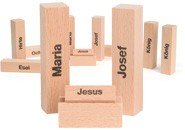 Wem Weihnachten zu kitschig ist, der findet bei den Krippen auch abgespeckte Versionen. Mit der allerschlichtesten lässt sich auch auf ganz einfache Weise ein Statement gegen allzuviel Pomp rund ums Weihnachtsfest abgeben. Sie besteht aus ein paar Klötzchen, aufgeprägten Namen und etwas Fantasie. Sie ist gewissermaßen ein Augenzwinkern gegenüber der weihnachtlichen Üppigkeit mit ihren wallenden Gewändern und goldlackierten Gaben.