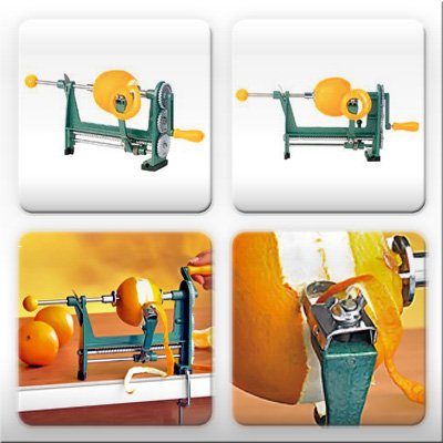 Ganz ohne Gatschen und Matschen soll das Schälen mit diesem tollen Orangenschäler funktionieren, der eigentlich eher mehr an ein Heimwerkergerät als eine Küchenmaschine erinnert. Die Orange wird einfach eingespannt und dann wird losgekurbelt, wirklich einfach! Die Schale wird in einem Stück abgezogen und sauber geschält. Genauso sauber bleiben Finger und Hände bei dieser Methode.