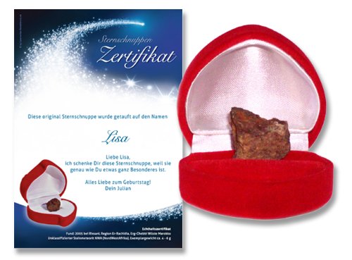Es gibt vielfältige Anlässe, zu denen Sternschnuppen als besondere Geschenke überreicht werden können. Beispielsweise zu einer Hochzeit. Wünschen Sie Ihren Bekannten zur Vermählung alles erdenkliche Glück und überreichen Sie besondere Geschenke in Form einer Sternschnuppe mit Zertifikat. Besonders begehrt sind diese besonderen Geschenke auch zum Valentinstag. Als Geschenk für die Liebste oder den Liebsten, verpackt in einer Herzschatulle, bereitet die Schnuppe jedem eine riesige Freude.