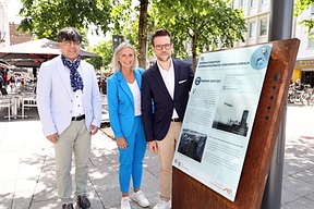 Foto: Der Fachbereichsleiter Stadtbibliothek und Stadtarchiv Yilmaz Holtz-Ersahin, die Beigeordnete für Bildung, Kultur und Sport Christiane Schüßler sowie Oberbürgermeister Felix Heinrichs bei der offiziellen Eröffnung des Informationspfads Hindenburgstraße. ©Stadt MG