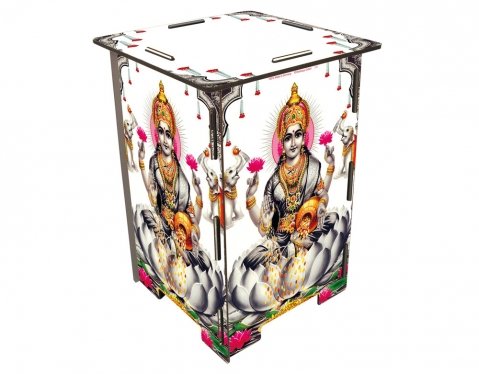 Auf einer Lotosblüte sitzend lächelt uns die indische Göttin Lakshmi an, rote Lotusblüten in den Händen. Sie bringt und Glück, Schönheit und Reichtum in das Haus, ist aber auch für die Gesundheit zuständig. Zwei Elefanten sind an ihrer Seite und übergießen Gajalakshmi sie mit Wasser. Diese Darstellung ist auch in indischen Wohnhäusern häufig zu finden. Der Hocker wird in Weiß und Blau angeboten.