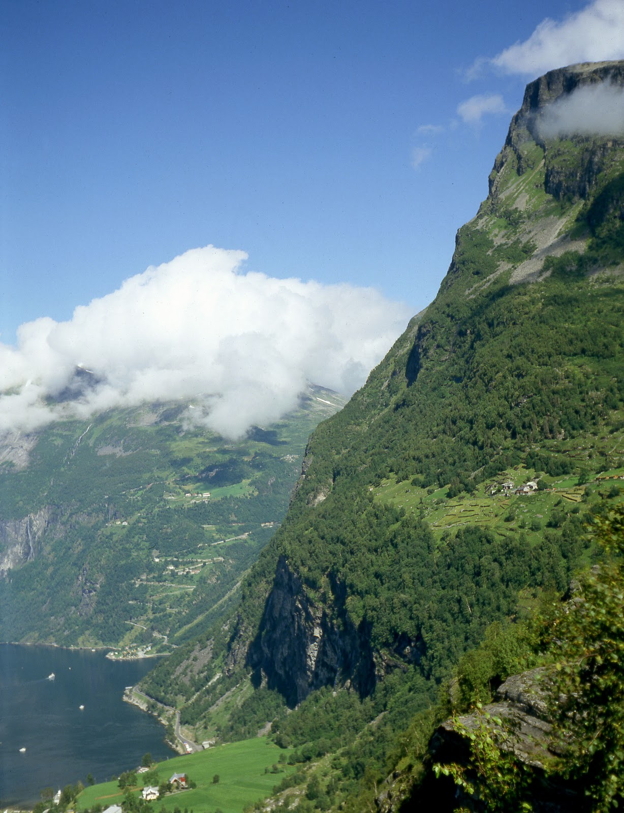 Auch das nächste Bild ist vom gleichen Standort - einer Wiese über dem höchsten Parkplatz der Adlerkehren - aufgenommen worden. Es zeigt den Dalsnibba links hoch über Geiranger. Beim nächsten Bild (4) geht der Blick von Geiranger aus zurück. Darauf ist die Kapelle Geirangers zu erkennen und am Ende des Fjordes der großen Campingplatz. gezeigt.