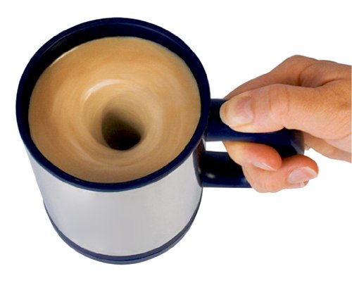 Lustig: Mit der automatischen Kaffeetasse muss man die Büroküche nie mehr nach einem Löffelchen absuchen. Bei diesem Modell genügt ein Knopfdruck. Der kleine Propeller am Tassenboden sorgt dafür, dass automatisch umgerührt wird. Es braucht keinen weiteren handgriff mehr, um Milch und Zucker unterzumischen