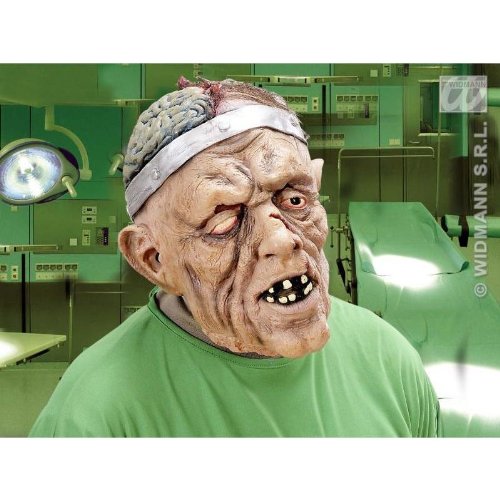 Dieser Herr entfaltet seinen besonderen Charme erst auf den zweiten Blick: Nicht nur seine Frisur ist ein wenig mitgenommen, nein,auf der rechten Schädelhälfte liegt das Gehirn blank in der Luft und der Farbe nach zu schließen, ist es auch nicht mehr ganz frisch. Auch das blinde rechte Auge, das lückenhafte Gebiss und ein Cut auf der Nase zeigen, dass der Mann schon einiges mitgemacht hat. Ist er seinen Peinigern vom OP-Tisch entflohen? Oder handelt es sich um einen Untoten, der im OP wieder regenerierte werden sollte? Stammt der Mann aus dem Labor von Dr. Frankenstein? Wir wissen es nicht. Aufsehen erregen Sie mit dieser außergewöhnlichen Halloween-Maske aber bestimmt.