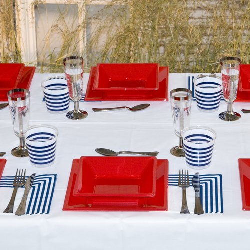 Bei einer maritimen Dekoration sind die Hauptfarben weiß, blau und evtl. rot. Es bietet sich auch eine weiße, natur(sand)farbene oder blaue Tischdecke an. Wenn Sie einen rustikalen Tisch haben, muss nicht unbedingt eine Tischdecke verwendet werden. Es ist beispielsweise sehr schön, ein Fischernetz zu verwenden, entweder als Tischdeckenersatz, um die Tischmitte zu dekorieren oder auch als Wanddeko.