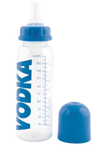 Auch sie zählt in die Kategorie: Eltern, regt euch nicht künstlich auf. Natürlich ist in keiner Babyflasche wirklich Vodka drin. Aber witzig ist's schon, wenn auf der Flasche genau das drauf steht. Zählen Sie mal mit wie viele Mütter und Väter das Gesicht verziehen, wenn Sie Ihr kleines Baby mit solch einer Flasche stillen. Da haben Sie ganz sicher was zu erzählen, wenn der kleine Hosenscheißer älter geworden ist.