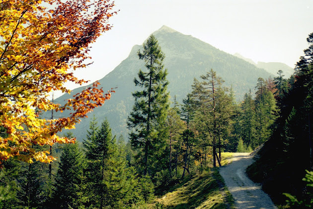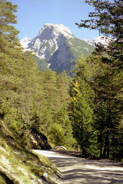 Wer noch Lust verspürt oder Neugierde, folgt der Straße 2.200 Meter bis zur Kastenalm (1.220 Meter hoch). Nach etwa 800 Metern ist die Birkkarspitze zu sehen. Mit 2.749 Metern ist sie der höchste Berg im Karwendel. Die gleiche Strecke zurück zeigt neue Ausblicke, zum Beispiel auf die Ahrnspitzen. Der Fotofreund kommt voll auf seine Kosten. |