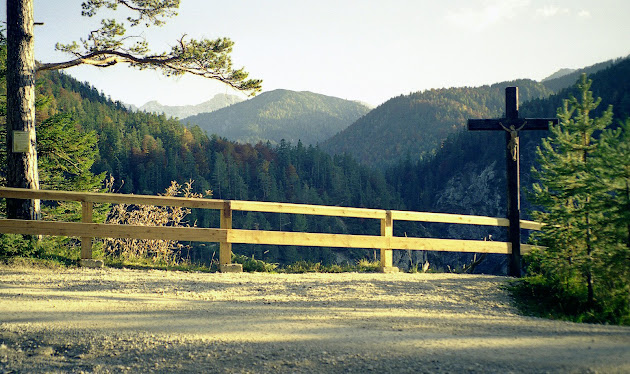 Auf dem Rückweg der Tour - ob von der Kastenalm, Isar-Ursprung oder Isarklamm - kommt der ausdauernde Wanderer bei der Gleirschhöhe an einem großen Kreuz am Straßenrand vorbei. Hier lohnt sich der prächtige Blick in Richtung Nordkette. Ein Erlebnis, diese Berge des Karwendels einmal nicht von der innsbrucker Seite, sondern vom Norden aus zu sehen. Gemütlich geht es jetzt auf der Hinterautalstraße abwärts. Bald lädt linker Hand das Gasthaus Wiesenhof zur einer erholsamen Rast ein. Mittwoch ist Ruhetag. Gestärkt schafft der Wanderfreund dann auch noch die letzten dreißig Minuten bis nach Scharnitz, dem Ausgangspunkt der Tour.