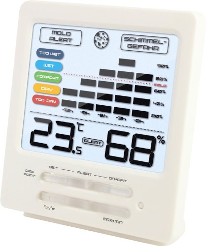 Das Gerät protokolliert alle zuvor festgelegten Grenzwerte für Raumtemperatur und Luftfeuchtigkeit und zeigt diese an. Sind die Grenzwerte niedrig genug eingestellt, wird dem Bewohner rechtzeitig bevor die Gefahr eines Schimmelbefalls gegeben ist gemeldet, dass er handeln muss. Es wird auch angezeigt, ob zur Optimierung des Raumklimas gelüftet werden muss oder vielleicht eher die Temperatur erhöht werden sollte, damit kein Schimmel entsteht.
