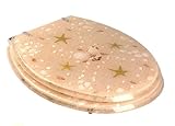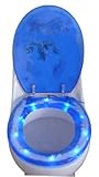 Äußerst beliebt sind Toilettendeckel mit Motiven, die das Meer oder den Strand ins stille Örtchen bringen sollen, darunter zählen auch Delphine bei den WC Sitz Designern. Dieses Modell ist etwas ausgefallener und eignet sich besonders für Toiletten, deren Dekoration schon in bläulich gehalten ist. Dieser Klodeckel leuchtet dank 10 LEDs in der Nacht blau auf. Klappt man die Klobrille zu, sieht man zwei Delphine und den Meeresgrund samt Sand und Muscheln. In meinen Augen ist der Toilettensitz zu blass, aber das ist Geschmackssache. Die LEDs leuchten dank eines Kontakts erst auf, wenn der Deckel gehoben wird. Ein Nachteil an diesem Modell ist, dass die notwendigen Batterien natürlich nicht ein Leben lang heben und somit immer wieder ausgetauscht werden müssen. Dies kostet natürlich weiter Geld, wenn man möchte, dass der Toilettendeckel weiterhin leuchtet. Leider sind die Batterien auch nicht enthalten und müssen daher extra noch dazu gekauft werden.