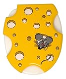 Süß, nicht? Ähnlich wie beim Apfel-Klodeckel ist diese WC-Brille hier mit einer Maus ausgestattet, die sich durch den Käse frisst. Der Käse hat links und rechts ein paar Einkerbungen, die dazu dienen, den Deckel anzuheben. Dabei ist eine leicht verständliche Anleitung, um alles zu befestigen und die Qualität ist sehr gut, wie von der Firma Wenko gewohnt.