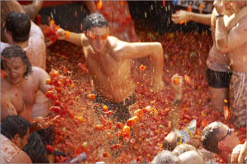 In den letzten Jahren kamen jeweils rund 45000 Touristen ins 10000-Einwohner-Städtchen in der Region Valencia, um sich den Spaß zu machen und bei dem groß angelegten Festival Tomaten durch die Gegend zu schmeißen. Tonnenweise werden die Paradiesäpfel für das einmalige Event angekarrt, im Jahr 2004 schafften es die roten Geschosse ins Guinessbuch der Rekorde: 125 Tonnen wurden verballert!