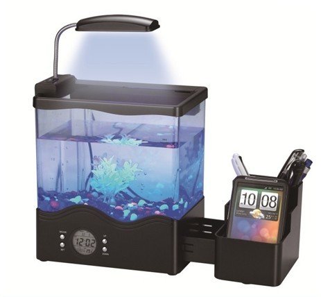Neben der recht großzügigen Wohnfläche, die mit Grünpflanzen, Korallenriffimitaten und anderen Materialien architektonisch ausgestaltet wird, bleibt nebenan ebenso noch ein gemütliches Fach für Stifte, Notizen und weitere kleine Büroutensilien. Die dazugehörige LED-Leuchte dienst einerseits als Flutlichtdusche für die Tiere, andererseits darf sie jedoch auch als indirekte Lichtquelle für diverse Schreibtischtätigkeiten zweckentfremdet werden – wie gesagt, nur indirekt, da natürlich in erster Linie die Fische auf den beruhigenden Lichteinfall angewiesen sind. Durch einen kleinen Flüssigkeitszufluss aus einem an der Oberseite des Aquariums angebrachten Wasserhahn, wird das Nass direkt gefiltert und somit gereinigt. Die moderne Ausstattung dieser Objekte wird meist noch durch zusätzliche Anzeigeoptionen für Datum, Zeit und Temperatur unterstrichen, die durch ein Display an der Außenseite des Gehäuses dargestellt werden. Mit einem extra Sound-Schalter lassen sich bei manchen Modellen sogar echte Teichgeräusche (Wassergeplätscher, Grillengezirpe, Froschquaken etc.) einstellen. Ein Netzstecker für die Wasserpumpe des Aquariums ist natürlich weitaus empfehlenswerter und kostengünstiger als einen Dauerbatteriebetrieb aufrecht zu erhalten.