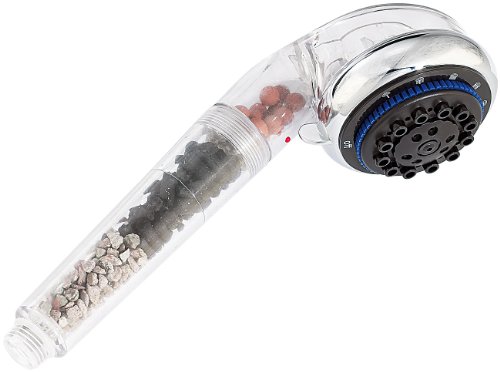 Ein günstiges, aber sehr spezielles Modell ist dieses hier. Der Duschkopf ist mit Mineralien gefüllt (Aktivkohle, Maifan, Zeolithstein), die das Wasser filtern und weich machen. Das ist besonders gut für Haut und Haare, reguliert den PpH-Wert und wirkt extrem belebend. Eine weitere Besonderheit ist, dass man zwischen neun verschiedenen Stärken wählen kann, wenn man den Strahl einstellt, toll also, für individuelle Massagen. Auch dieser passt auf fast jeden Schlauch.